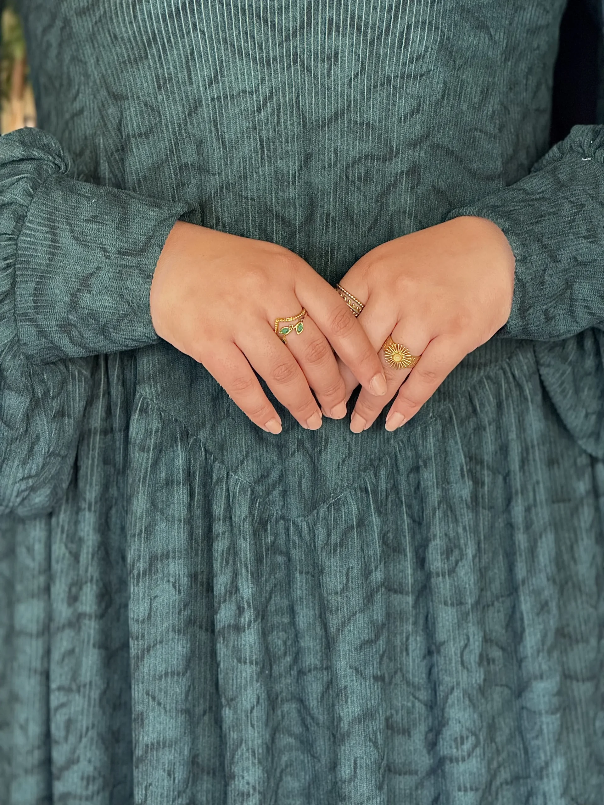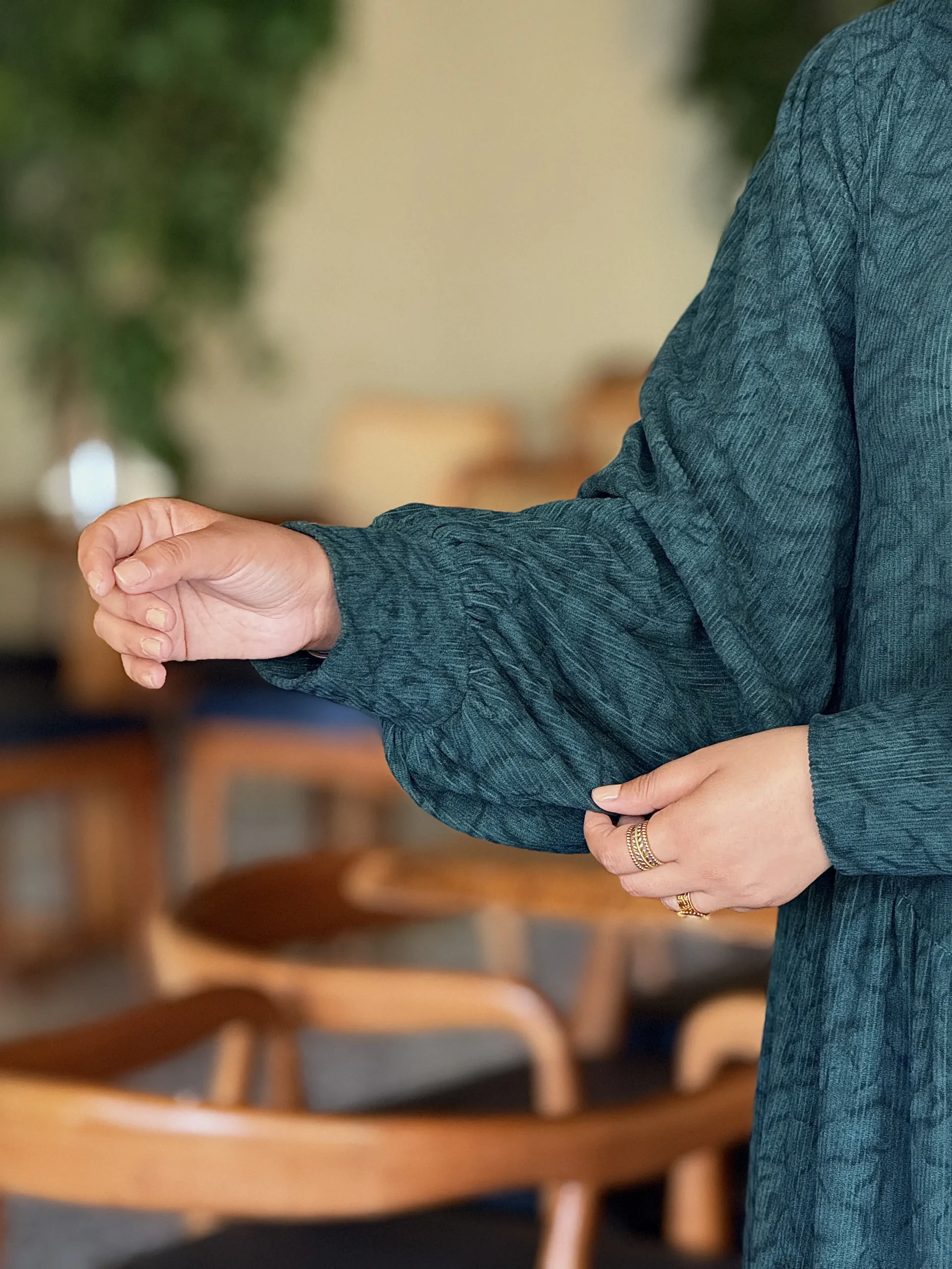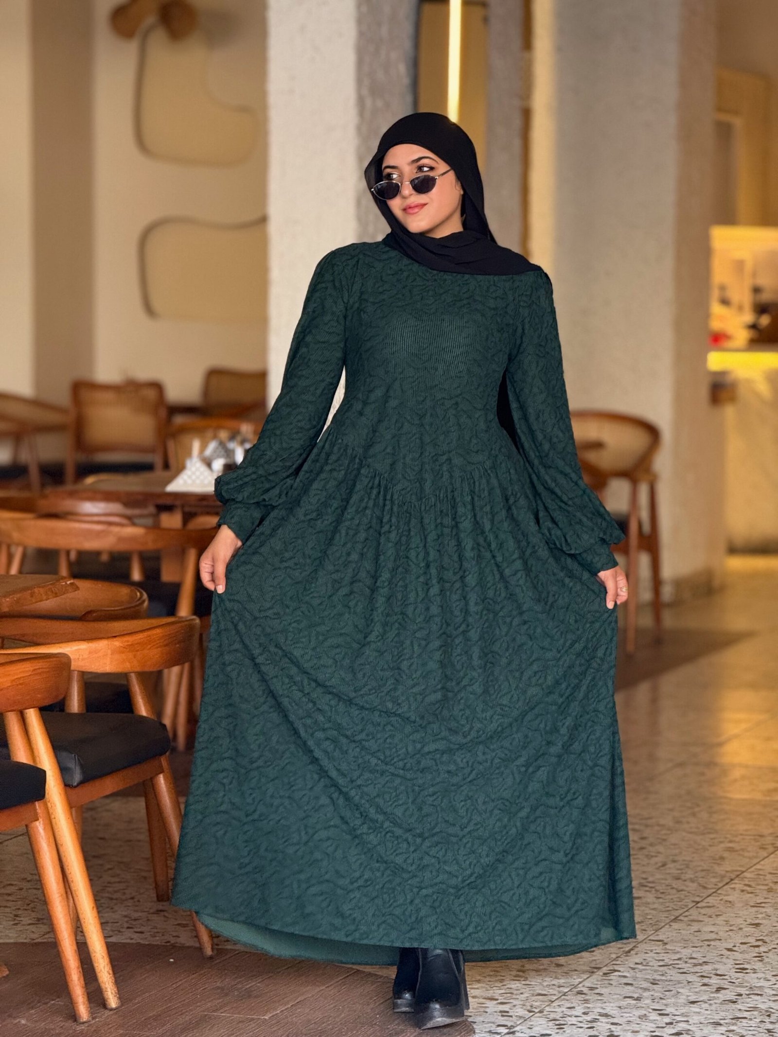 احصلي على إطلالة أنيقة وغير تقليدية مع فستان قطيفة مضلع مشجر بلون زيتي المصنوع من خامة قطيفة مميزة ومريحة تناسب الخروج والمناسبات.